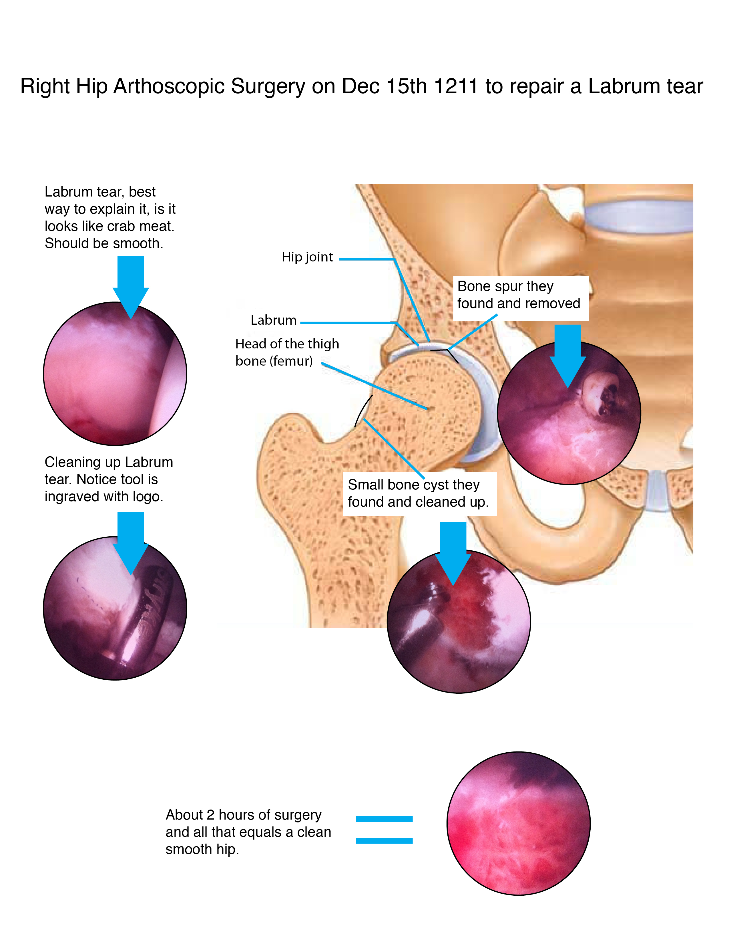 I had right hip Arthoscopic Surgery back on Dec 15th. They went in to repair a labrum tear. Making the decision to go through with surgery goes in the logbook as one of the hardest decisions I have had to make. After what they found in surgery and with where I am at in recovery I know it was the best decision.
