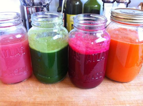 Left to Right. Grapefruit Juice, Green Juice (that recipe next time), Beet Juice, and Carrot Orange, that ones simple Half Carrots half Orange. Enjoy!